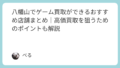 八幡山 ゲーム買取の概要八幡山駅周辺でゲームソフトやゲーム機本体、周辺機器を売りたい方向けに、店頭買取・宅配買取・出張買取に対応しているゲーム買取店をまとめました。京王線沿線の八幡山は、千歳烏山や笹塚、新宿方面へのアクセスが良く、複数店舗を比較しやすいエリアです。ゲームは需要とタイミングによって買取価格が変動しやすいため、店舗選びと売却時期が重要になります。まずは確認|八幡山のゲーム買取対応店舗一覧店舗名 買取の特徴 アクセス
