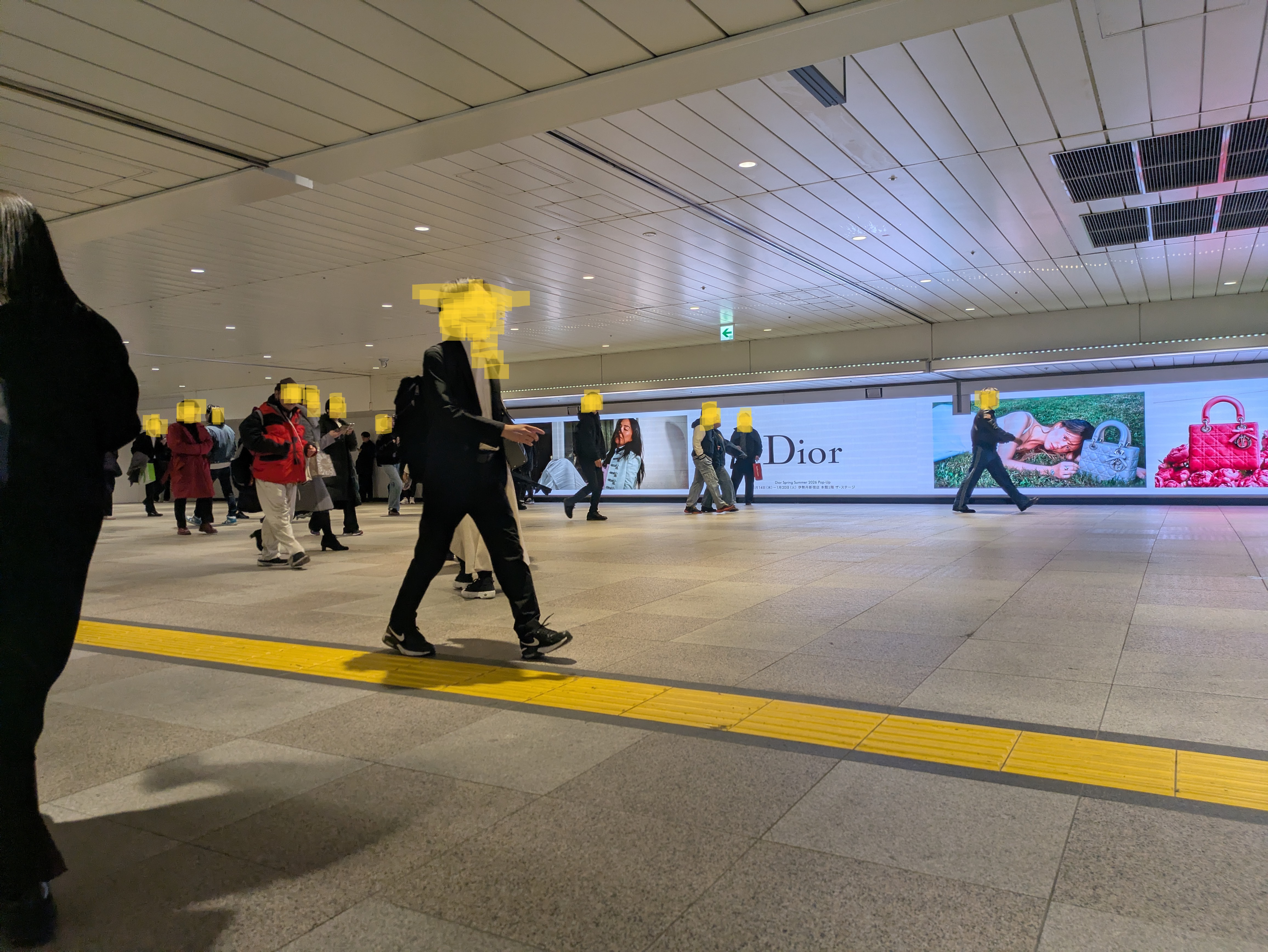 ※地下通路の様子。比較的狭めの通路、天井に案内板