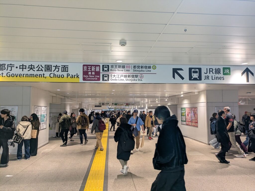 JR線(中央線・山手線)から都営新宿線・京王新線への最短ルートは、JR東改札または西改札を出て、東西自由通路を通り、地下通路経由で京王新線方面へ向かう行き方です。このルートは完全に屋内なので、雨に濡れない行き方としても最適です。